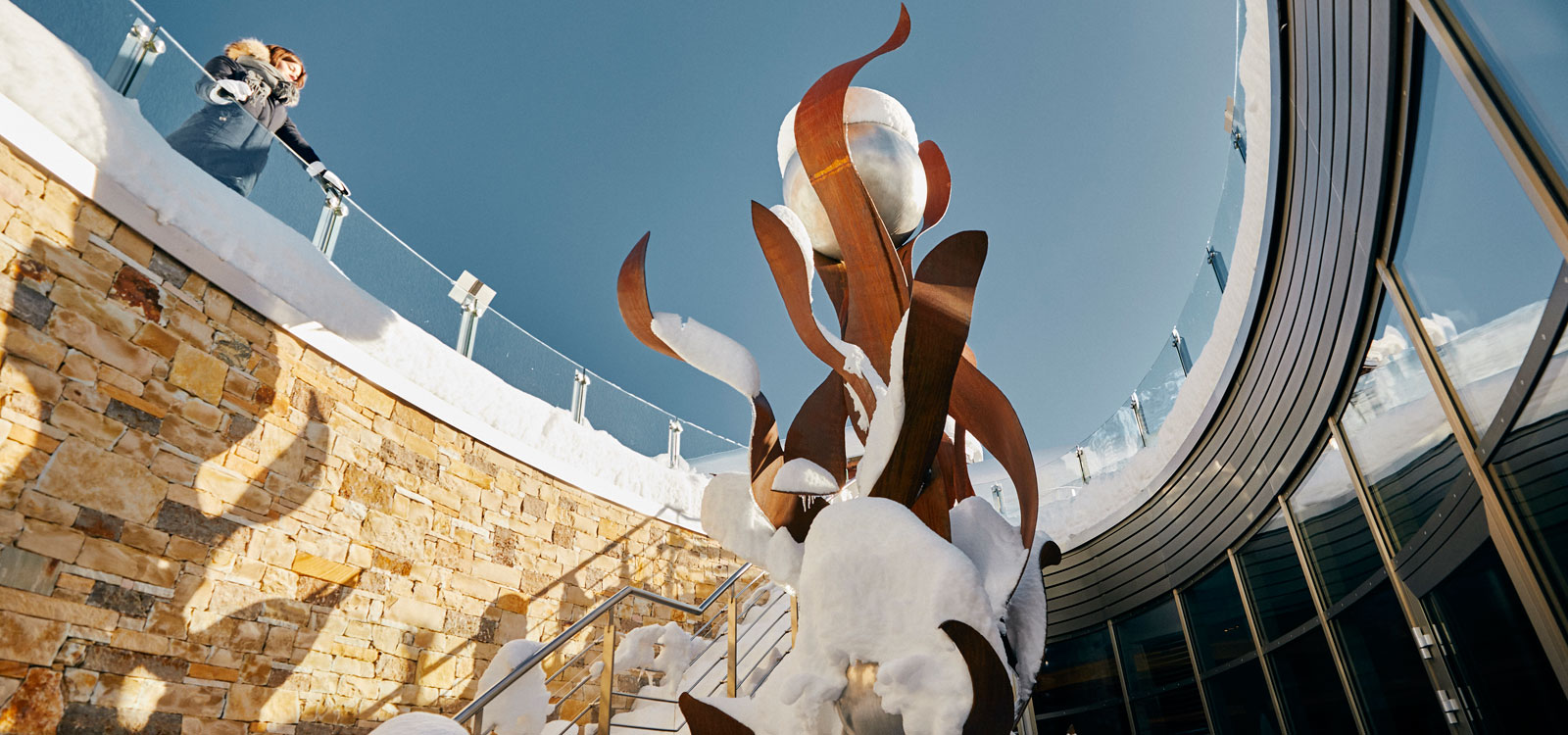 Die Skulptur „Feuererde“ am ARTWALK in Lech fängt den ständigen Kreislauf von Veränderung und Wandel ein, der durch die dynamisch aufsteigenden Flammen symbolisiert wird. Im Zentrum dieses Feuers ruht fragil der Planet Erde – ein Sinnbild für die Balance, die durch menschliches Handeln sowohl unterstützt als auch gefährdet wird.